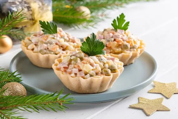 Колбаса докторская, Картофель, Морковь, Огурцы соленые, Яйца куриные, Горошек зеленый, Укроп, Петрушка, Майонез МЖК